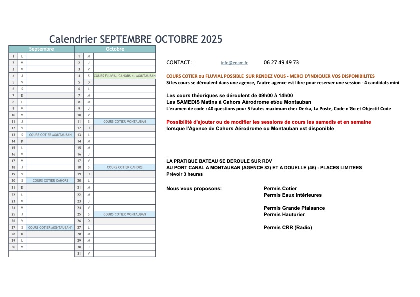 Idem permis côtier ou fluvial Supplément de 30 euros de frais d'inscriptions à régler directement à l'organisme choisi lors de l'inscription en ligne |